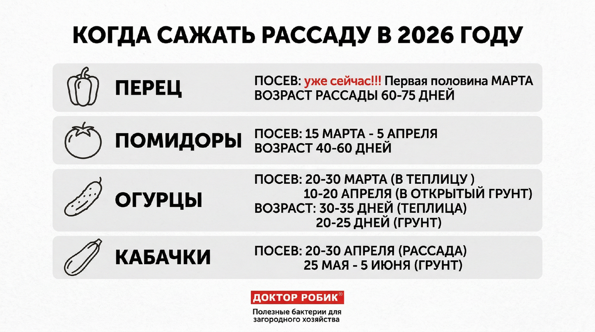Весна уже на пороге, и самое время спланировать посевную. Мы собрали для вас проверенные сроки посева основных культур, чтобы рассада выросла крепкой и не переросла к моменту высадки. Сохраняйте этот постер и сверяйтесь с ним в самые ответственные дни!