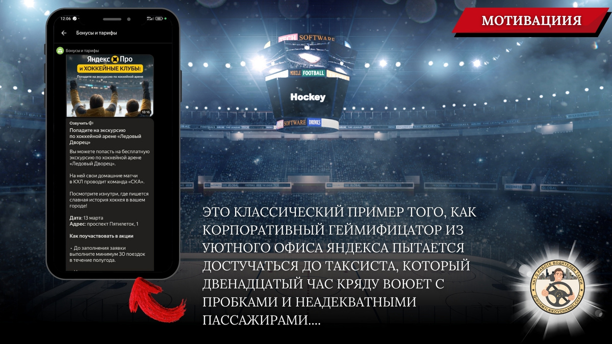 Глядя на свежие бонусы в Яндекс Про, невольно задаюсь вопросом: в какой параллельной реальности живут сотрудники офиса Яндекс Такси? На этот раз нам предлагают не просто ачивку в профиль, а целый поход на хоккейную арену. Видимо, по мнению менеджмента, мне после смены не хватает именно льда, драйва и напряжения, криков трибун и еще пары часов на ногах. Сотрудник Яндекса, если ты читаешь этот канал, давай я проясню тебе базу: таксист выходит на линию не за социализацией и не ради возможности попинать футбольный мяч с коллегами по цеху как вы настойчиво предлагали в прошлом году. Такси, это максимально жесткая, потогонная, полная бесправия сдельная работа.