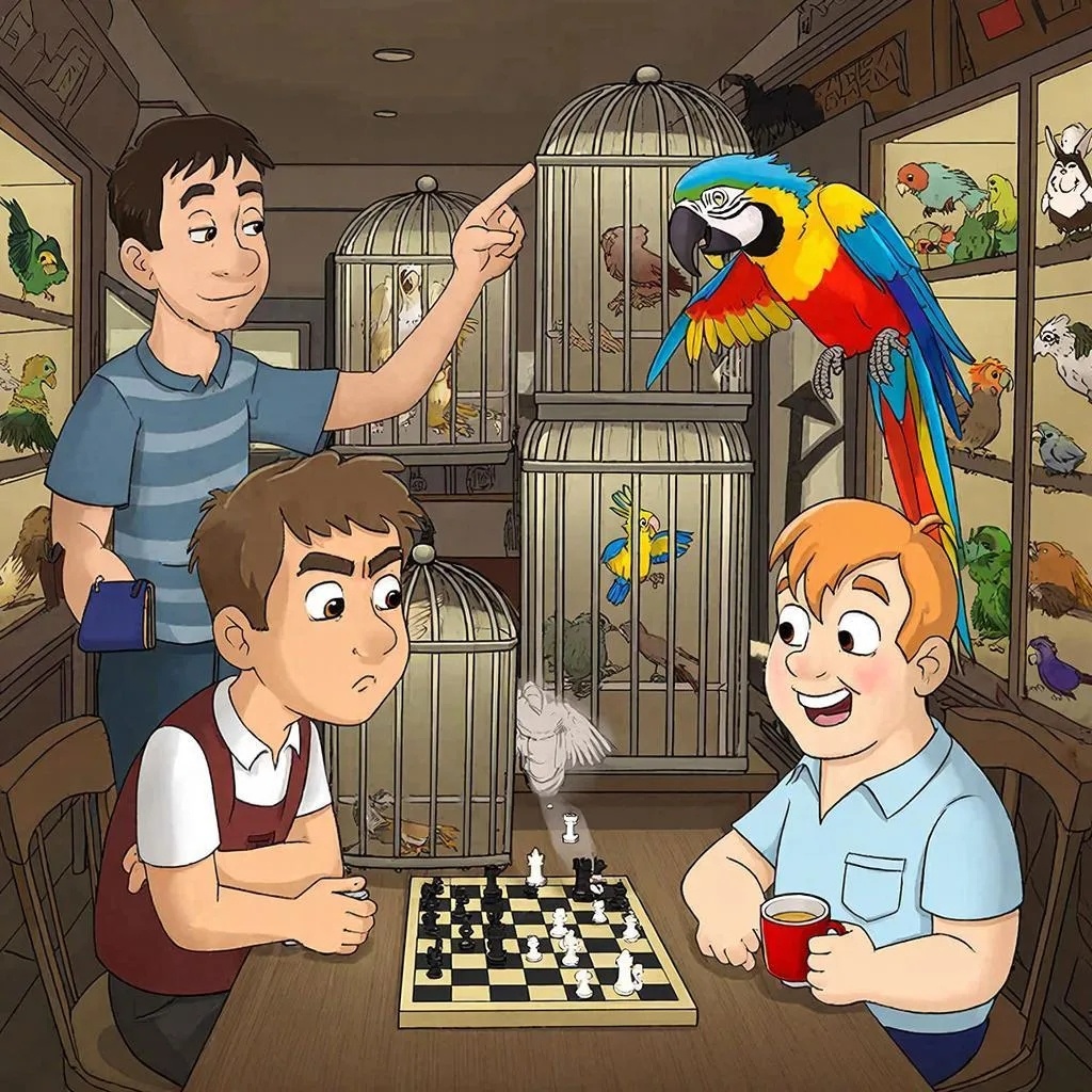 Парень изумлённо уставился на говорящего птичьего друга, покачал головой, улыбнулся и согласился сыграть. Они расставили фигуры, сделали первые ходы, и буквально спустя несколько минут...