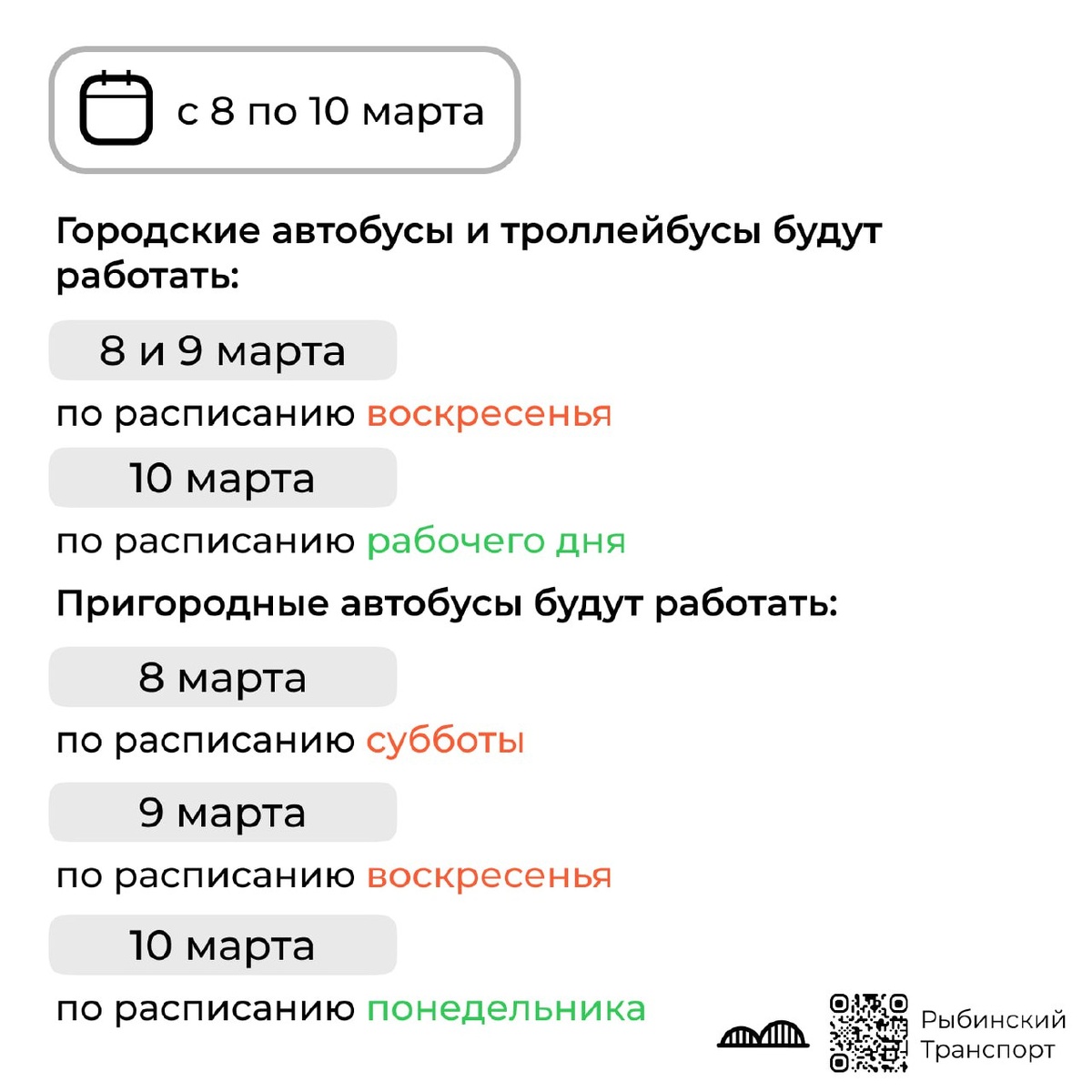 В связи с празднованием Международного женского дня в Рыбинске и Рыбинском округе меняется режим работы транспорта. Городские маршруты (автобусы и троллейбусы): • 8 и 9 марта — работают по расписанию воскресенья; • 10 марта — работают по расписанию рабочего дня. Межмуниципальные маршруты (пригородные): • 8 марта — расписание субботы; • 9 марта — расписание воскресенья; • 10 марта — расписание понедельника.