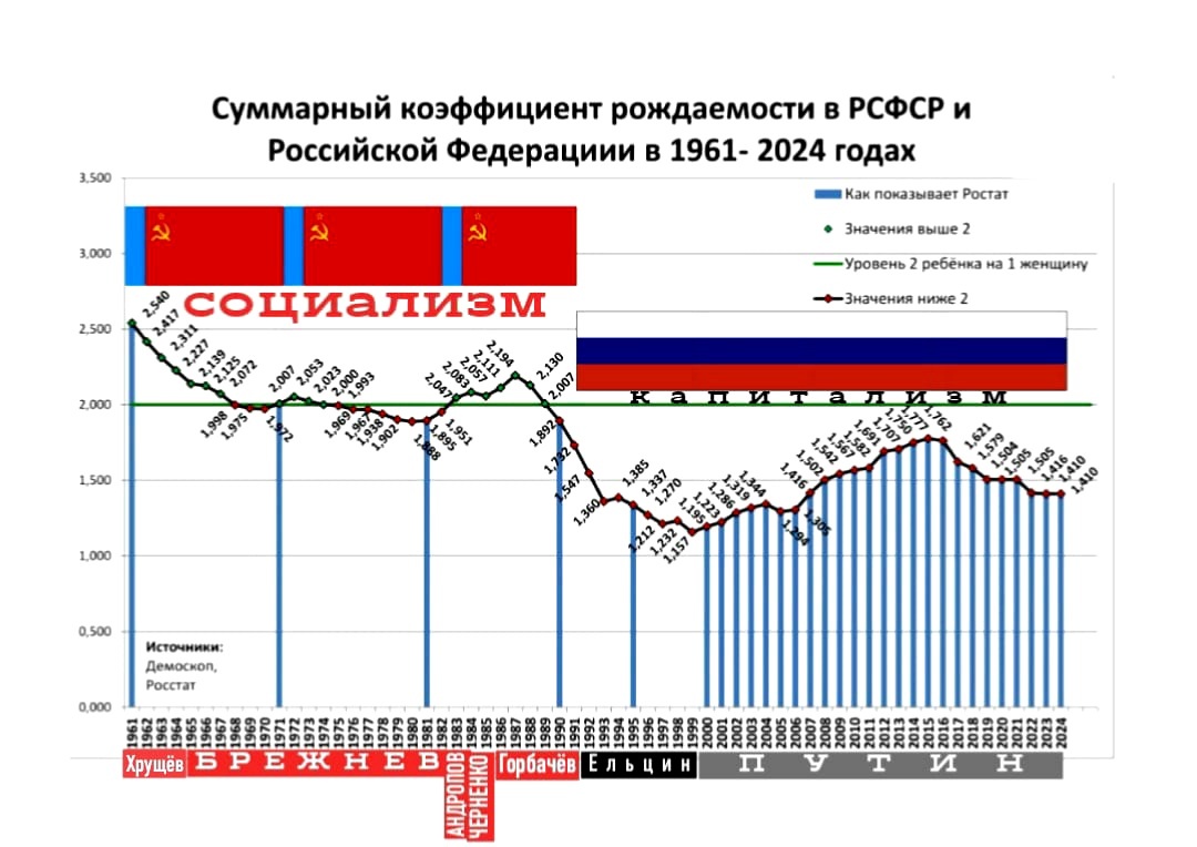 Здраствуйте, уважаемые читатели дзена. Предлагаю к вашему вниманию сравнительную характеристику двух экономических систем, социализма и капитализма и их влияние на рост населения нашей страны. Как видим, в Советской России, руководимой коммунистами, чаще наблюдался рост населения (демографический рост) в сравнении с нынешней капиталистической Россией. Факты - вещь упрямая, заставляющая задуматься о правильности или ошибочности навязанного со стороны США в 90-х при Ельцине пути!