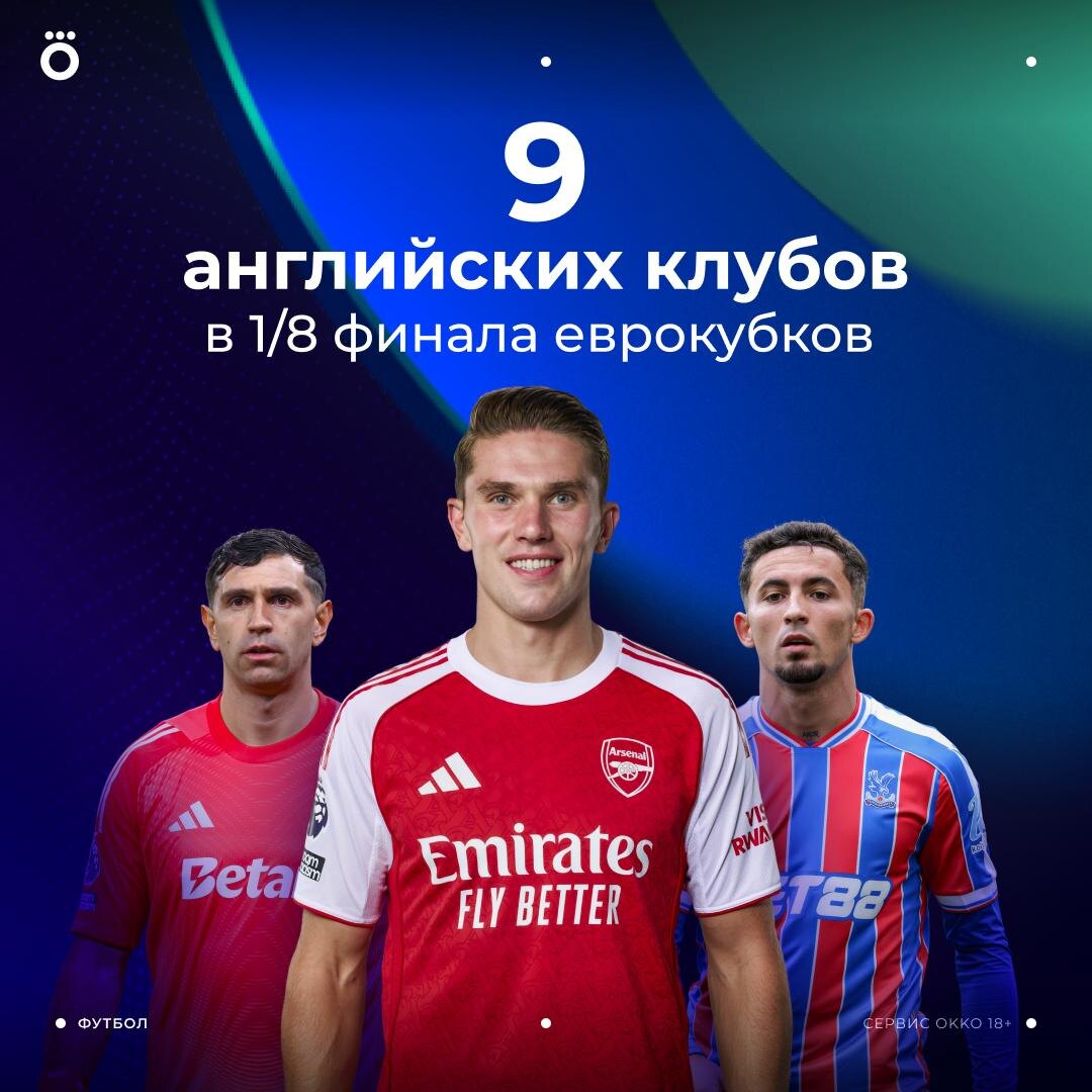 Их очень много в 1/8 финала еврокубков 🏴 Шесть топов в ЛЧ, «Астон Вилла» и «Ноттингем» в ЛЕ и «Кристал Пэлас» в Лиге конференций. Смогут ли англичане выиграть все три турнира в этом сезоне? 👍 / 👎 😃 Смотри Okko прямо сейчас!