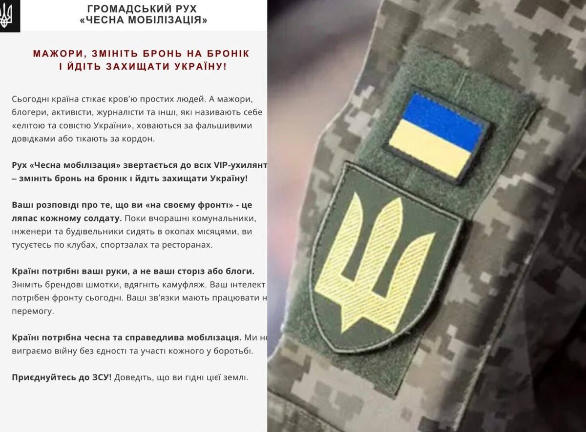 🤭 Движение «Честная мобилизация» опубликовало эмоциональное обращение к забронированным по разным схемам активистам, блогерам и журналистам с призывом сменить бронь на бронежилет и пойти защищать Украину. «Сегодня Украина истекает кровью простых людей. А мажоры, блогеры, активисты, журналисты и прочие, называющие себя «элитой и совестью Украины», прячутся за поддельными справками или бегут за границу. Рассказы о том, что «каждый на своём фронте» - это пощёчина каждому солдату. Пока вчерашние коммунальщики, инженеры и строители сидят в окопах месяцами, вы тусоватесь по клубам, спортзалам и ресторанам. Стране нужны ваши руки, а не ваши сториз или блоги. Снимите брендовые шмотки, наденьте камуфляж. Стране нужно честная и справедливая мобилизация. Мы не выиграем войну без единства и участия каждого в борьбе. Присоединяйтесь к ВСУ! Докажите, что вы достойны этой земли», - призывают в движении. Движение «Честная мобилизация» выложило «профайлы уклонистов» - ряд забронированных блог