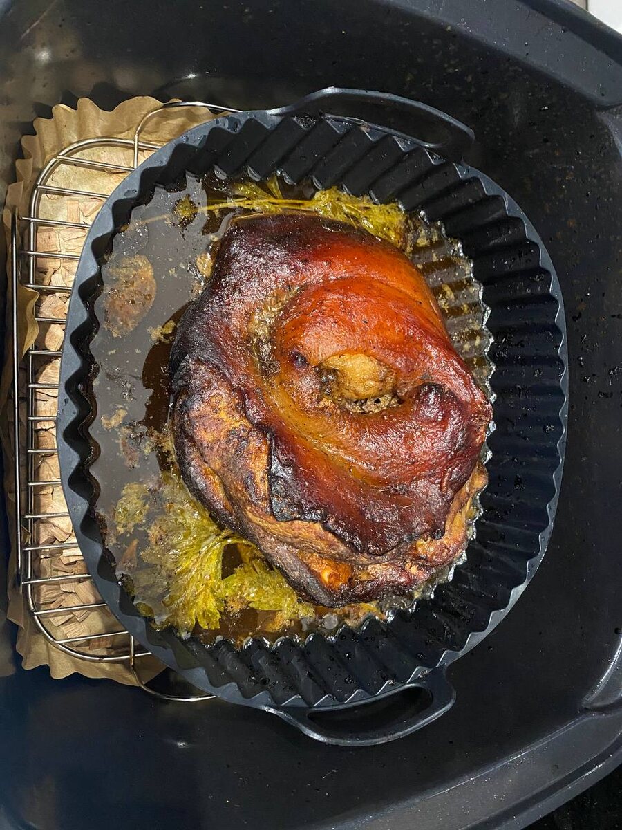 Отварите рульку в смеси светлого пива и воды (1:1) в течение 45–60 минут. Это делает мясо мягким внутри и помогает специям проникнуть глубже. Бульон после варки не выливайте — он пойдёт в бигос. Шаг 3. Закладка в Грандшеф
