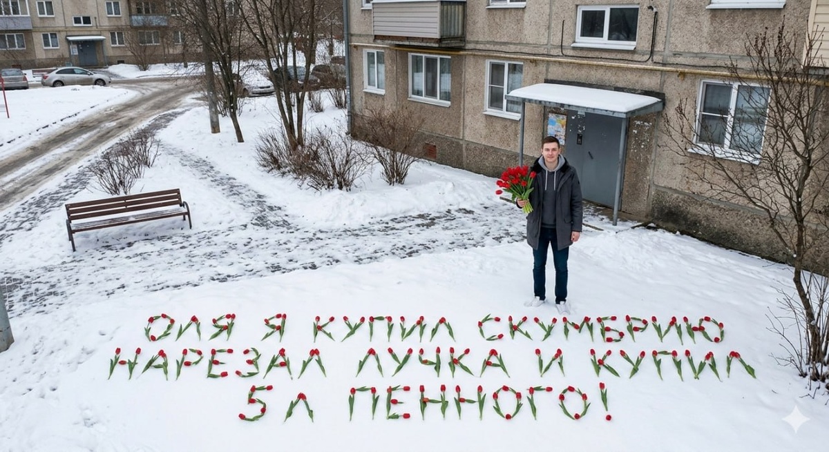 Мужики бегом повторять тренд! Молодой мужчина стоит на снегу, под окном дома,перед подъездом, держа в правой руке большой букет красных тюльпанов. На нём тёмная парка, серый худи с капюшоном, тёмно-синие джинсы и белые кроссовки. Выражение лица спокойное, взгляд направлен прямо в камеру. Черты лица точно воспроизведены с загруженных фотографий. Мужчина расположен справа в кадре. Перед ним на снегу выложена надпись из воткнутых в землю стеблем красных тюльпанов - "ОЛЯ Я КУПИЛ СКУМБРИЮ НАРЕЗАЛ ЛУЧКА И КУПИЛ 5 Л ПЕННОГО!" На заднем плане — голые деревья, жилое здание, дорога и скамейка. Освещение мягкое, естественное, зимний день. **Цвет и атмосфера** Цветовая гамма построена на контрасте ярко-красных тюльпанов и белого снега. Здания и деревья выдержаны в приглушённых, холодных тонах. Атмосфера сцены — романтичная, с лёгкой ноткой юмора. Сьемка ведется сверху, 3-4 этажа. **Важно:** лицо и внешность персонажа должны точно соответствовать загруженным фотографиям — сохранить черты лица,