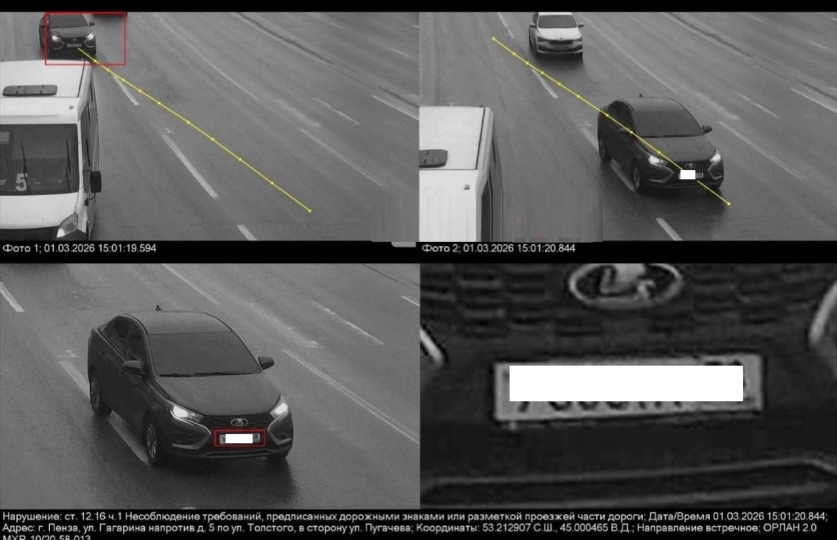 На фотографиях с камеры видеонаблюдения отчетливо видна ситуация: автомобиль перестроился на пешеходном переходе и одновременно пересек сплошную линию разметки. Соответственно, формально зафиксированное нарушение связано не с самим процессом перестроения, а с пересечением специальной линии, предназначенной для разделения потоков.