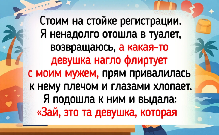 - Стоим на стойке регистрации. Я ненадолго отошла в туалет, возвращаюсь, а какая-то девушка нагло флиртует с моим мужем, прям привалилась к нему плечом и глазами хлопает. Я подошла к ним и выдала: «Зай, это та девушка, которая нам багаж понесет?» Так себе у нее лицо было.