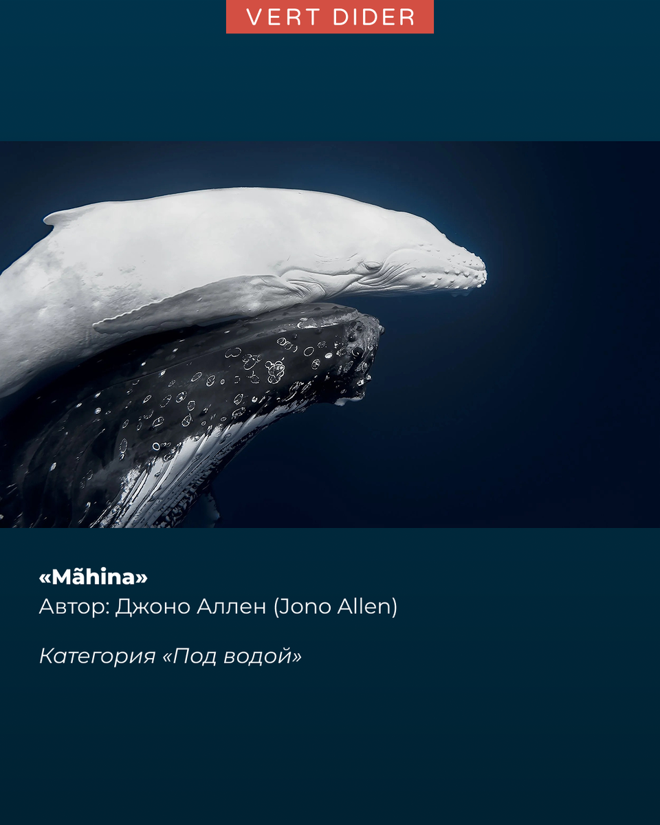 Первое место занял австралийский фотограф Джоно Аллен, получивший звание «Фотограф года в мире природы» за портрет редкого белого горбатого кита и его матери в водах Вавау, Тонга. Киту дали имя Mãhina («Луна» на тонганском). Появление альбиноса у горбатых китов встречается примерно 1 раз на 40 000 рождений. Сам конкурс проводится уже в седьмой раз, с 2020 года, и сейчас участие в нем принимают представители 51 страны. Миссия состязания — чествовать лучших фотографов-натуралистов мира и показывать красоту природы широкой аудитории в надежде, что люди предпримут какие-то шаги, чтобы сохранить планету для будущих поколений. Источник: World Nature Photography Awards