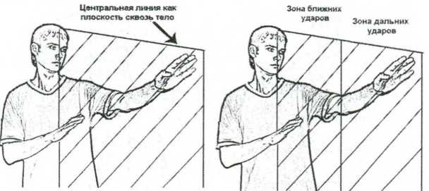 Центральная ось — вертикальная линия, проходящая через центр тяжести тела, разделяя его на две симметричные половины. Она проходит от макушки головы через позвоночник до центра масс. Цель защищающегося — держать свою центральную ось защищённой и устойчивой. Центральная линия — горизонтальная линия, соединяющая центральную ось вашего тела с центральной осью противника. Именно эта линия определяет направление и угол ваших атак и защит. Оптимальное положение достигается тогда, когда ваши центральные оси находятся лицом друг к другу ("face to face"). 2. Значение Центральной линии