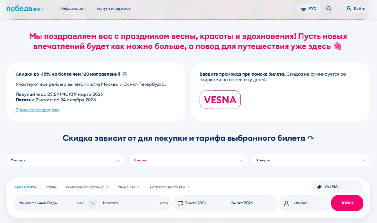 🟠До -15% на любые билеты в/из Москвы и Санкт-Петербурга. Из Минвод Победа летает только в Москву Внуково и Шереметьево 🟠Покупать билеты до 23:59 9 марта, даты вылета с 7 марта по 24 октября. Промокод вводится на сайте Победы, в поле поиска галочка "Есть промокод". ↗️ По промокоду VESNA 🔵 Цены действительны на момент публикации и могут изменяться ⚡️Не пропускай такие билеты! Подписывайся на нас в Телеграме | Max #КМВ #Пятигорск #Минводы #Минеральныеводы #Ессентуки #Кисловодск #Железноводск #путешествия #туры #билеты