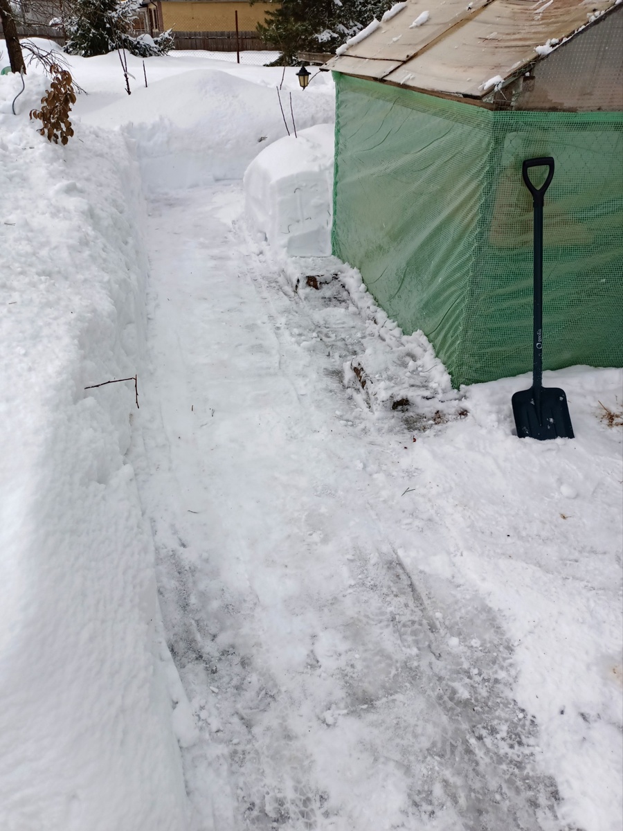 Я разгребал снег у курятников. Нужно было приготовить площадку. Туда скидывать снежно-ледяную массу из загона вдоль сарая. Потом её следовало разбросать по поляне снегоуборочной машинкой. Чтобы доставить машинку, пришлось прорыть тропинку. Не 40 сантиметров, как было, а минимум 60. Решил снегоуборщиком скидывать снег по ходу работы, а не вручную. Дело пошло толково. Раньше мне как-то не хватало сил.