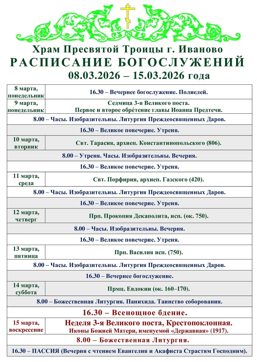 08-15.03. Расписание богослужений в Троицком храме г. Иваново