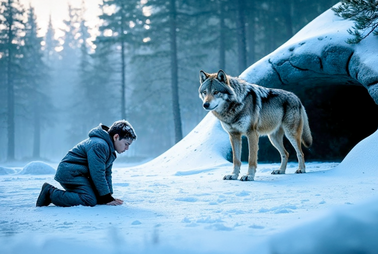 Эта ночь стала испытанием доверия. Мальчик свернулся калачиком, пытаясь унять дрожь, а волк лежал напротив, не смыкая глаз. Казалось, грань между хищником и жертвой стерлась. В какой-то момент, когда холод снова начал сковывать тело ребенка, случилось невероятное: зверь пододвинулся ближе. Он позволил мальчику прижаться к своему густому меху, делясь теплом своего тела.