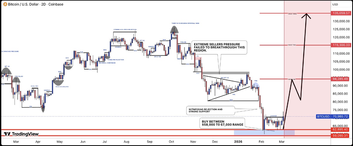 📈 Эксперты отмечают, что, несмотря на текущие колебания ниже $100 000, бычий импульс вокруг биткойна сохраняется, особенно в долгосрочной перспективе. Восстановление выше $70 000 на этой неделе, подкрепленное сильным бычьим объемом, свидетельствует о большом спросе и потенциале дальнейшего роста до $200 000. 📊 Ключевые моменты: - Недавний прорыв выше $72 000 сопровождался сильным бычьим объемом, указывающим на высокий спрос. - Первая значимая цель для биткойна — уровень $104 000 из-за "пустоты ликвидности", что может стать сопротивлением. - Прорыв $104 000 откроет путь к следующей крупной цели в $124 000, что почти является новым историческим максимумом. - Конечная цель текущего анализа — $134 000, после чего восходящий тренд может считаться завершенным.