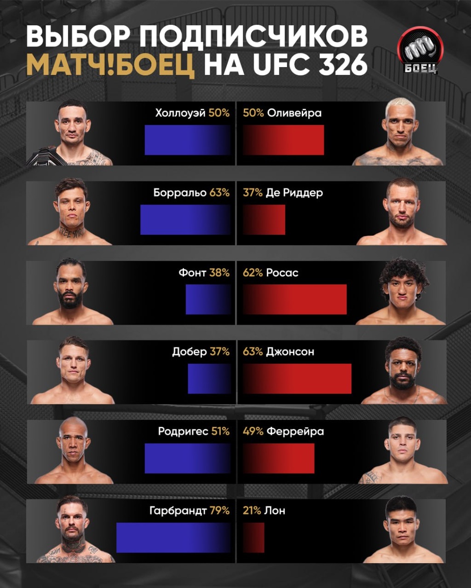 👀 Подписчики Матч!Боец определяли победителей на UFC 326. И в главном бою вышел паритет (хотя на несколько голосов всё же больше оказалось у Макса) ✅ В других парах всё оказалось куда более очевидно. Особенно у Гарбрандта. Коди проиграл два последних поединка, но в него по-прежнему верят 👊 Совсем скоро посмотрим турнир вместе с вами. На Матч!Боец 😉