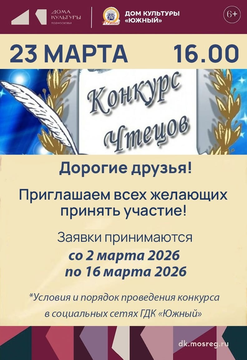 ✨ Дорогие друзья! Приглашаем вас приобщиться к конкурсу чтецов "Душа говорит стихами"✨ 🚫 Возраст: 6+ 📆 23.03.2026🕒16:00 🏢 Городской дом культуры «Южный» 📍 г.о.Домодедово, мкрн.Барыбино, ул.Южная, стр1А ✅ Мероприятия Домодедово https://dzen.ru/id/66f10385cc4c5a16f7b5fb02 https://vk.ru/domodedovo_events http://dzen.ru/domodedovo_events