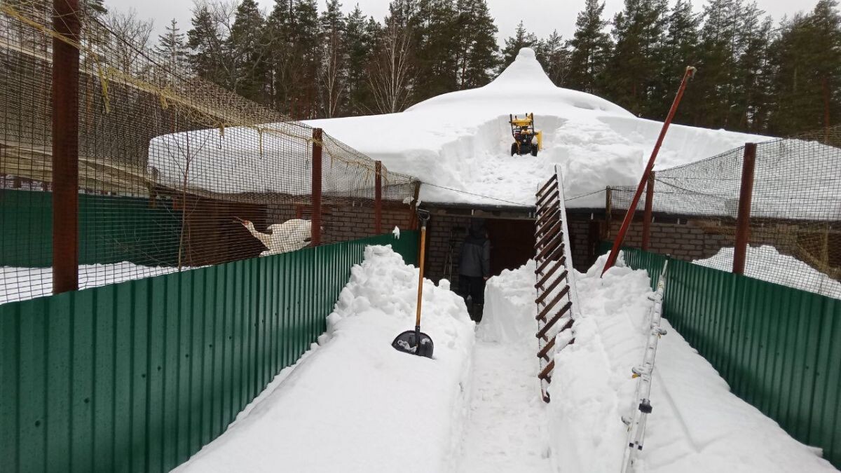 В Журавлином питомнике Окского заповедника продолжается масштабная уборка снега на фоне рекордного количества зимних осадков за всю историю наблюдений. Несмотря на конец зимы, снег продолжает накапливаться. 6 марта к работам подключились сотрудники отдела охраны и научного отдела. В первую очередь они сосредоточились на сбрасывании снега с крыш вольерных комплексов, чтобы предотвратить возможное обрушение конструкций под тяжестью наледи и мокрого снега. В ближайшие дни планируется расчистка уличных вольеров.