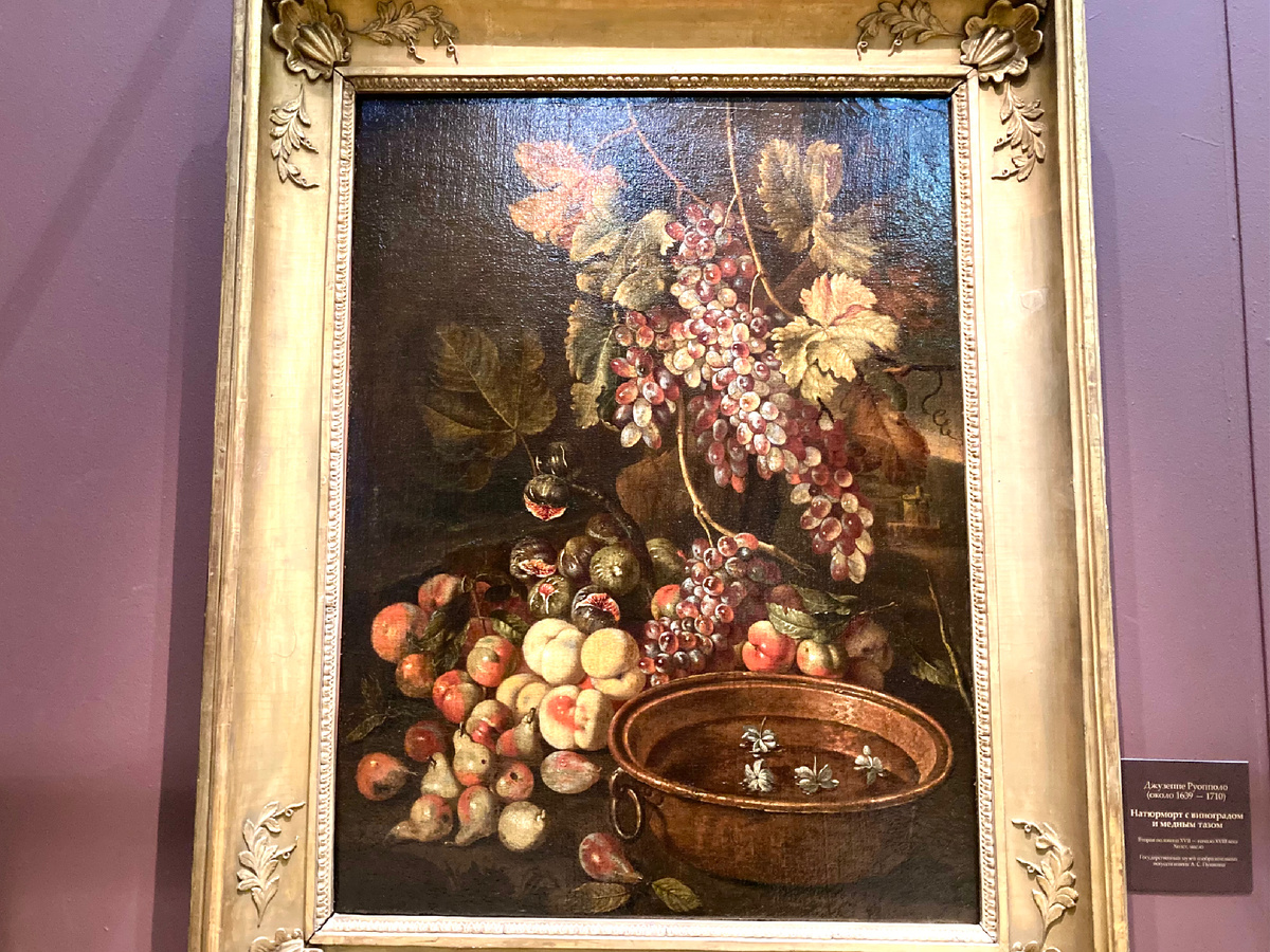 За окном мороз и слякоть, а в Тициановском зале музея цветы и фрукты. Приглушённый свет и мягкий колорит оформления в сливово- вкусный тонах наполняет пространство.