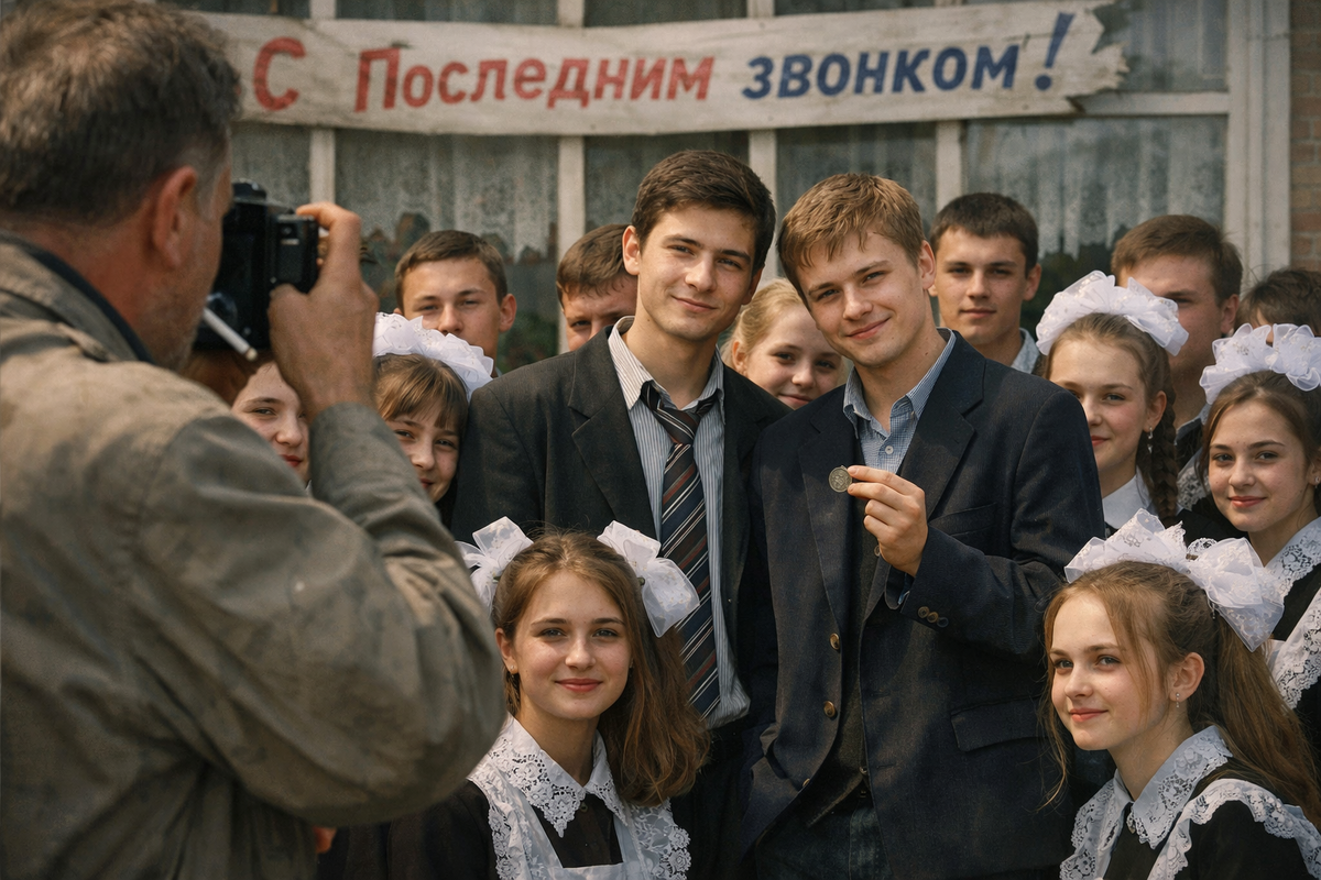 Илья стоял почти по центру, чуть позади девчонок, рядом с Серёгой Лебедевым — Серёгой, которого в классе звали «Лёба». У Лёбы была смешная привычка крутить в пальцах всё, что попадалось: колпачок от ручки, ключи, даже пуговицу на рукаве. Сейчас он крутил маленькую железную «пятёрку» — монетку. Тёр её ногтем так, будто хотел стереть год.