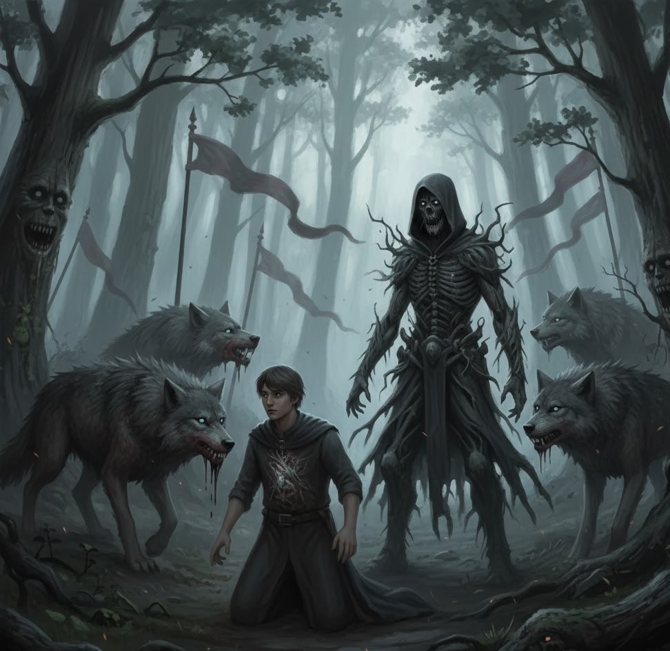 В самой чаще путь ему преградило рычание. Из темноты вышли волки. Но это не были обычные звери: их шерсть свалялась от запекшейся крови, а в пустых глазницах горел тот же призрачный огонь, что и у духа замка. Они окружили его, клацая зубами, из которых капала густая, черная слюна.