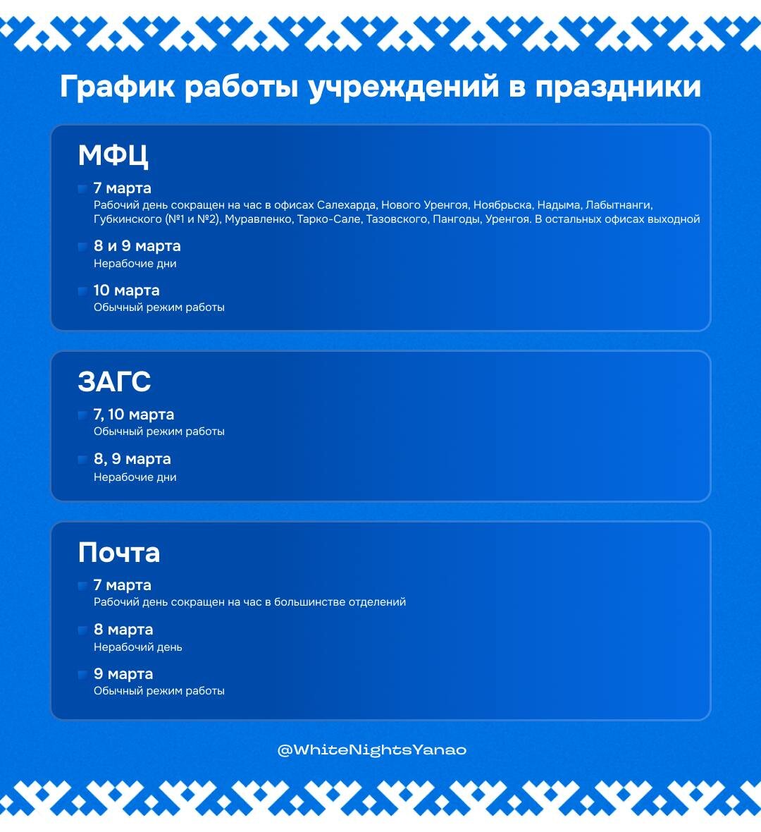 Из-за праздника многие учреждения на Ямале временно изменят график работы. Как будут работать МФЦ, ЗАГСы и почтовые отделения — смотрите в карточках ⬆ Подписаться | Прислать новость | Мы в MAX