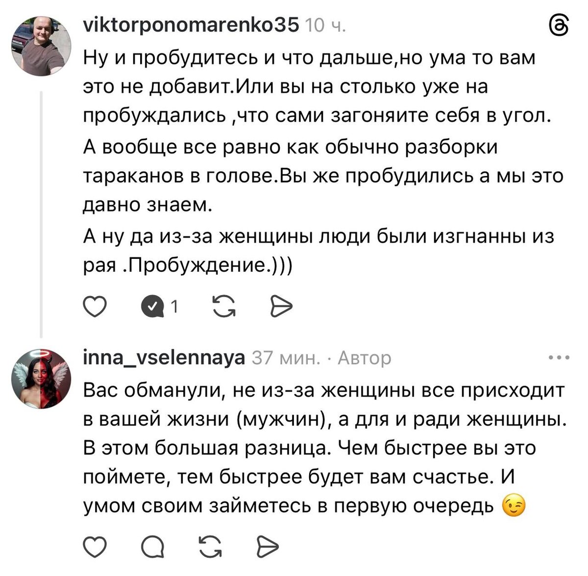 ? 😅 Уже до смешного доходит. Такую ерунду умудряются писать в сторону женщин, это как последние конвульсии перед смертью 🫢😁 Они видимо почувствовали опасность от женщин именно сейчас, так как именно сейчас женщины пробуждаются и объединяются, именно сейчас наступает эпоха матриархата. И собственно это им не нравится. Столько времени женщины были за мужчинами и сейчас они смело показывают то, что они сильные, независимые. И начинают пытаться их «сжигать на кострах», как тогда (наверное помните такие исторические факты). Вы не подумайте, я не мужененавистница, нет. Достойные мужчины, которых можно назвать мужчинами есть, и их не мало. Но вот диванные критики, которые внимательно выслушивают твой спитч, он им сильно не нравится и они пытаются биться в конвульсиях в комментариях - это такое себе зрелище. Я прям вижу в них вот этих маленьких мальчиков, у которых забрали конфетку и они плачут. А строгая мама поставила при этом в угол и дала ремня. И они теперь через свое поведение мс