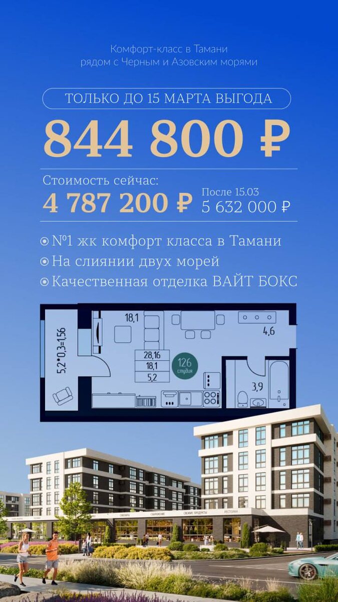 Пока рынок обсуждает рост цен, на юге появляются редкие точечные предложения, которые действительно могут сэкономить крупную сумму. Сейчас в продаже студия комфорт-класса в Тамани - месте, где Чёрное и Азовское моря находятся буквально рядом. 💰 Текущая цена: 4 787 200 ₽ 📈 После 15 марта: 5 632 000 ₽ Разница - 844 800 ₽. То есть сегодня можно зафиксировать квартиру почти на 850 тысяч дешевле, чем она будет стоить уже через несколько дней. Такие предложения, как правило, ограничены по времени и количеству квартир, поэтому долго на рынке они не задерживаются. ✉️ Напишите нам - расскажем все детали и поможем забронировать квартиру по текущей цене. Для связи: 📲 8-800-234-57-15 💬 +7(918)477-99-85 💬 ug_akcent 📷 artemovich_v 📺 ug.akcent