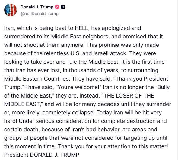 по ним огонь. Это обещание было дано только из-за непрекращающихся ударов США и Израиля. Они стремились установить контроль и править Ближним Востоком. Впервые за тысячи лет Иран потерпел поражение от окружающих его стран региона. Об этом написал в своем посте в Truth Social президент США Дональд Трамп. "Они сказали: "Спасибо, президент Трамп". Я ответил: "Пожалуйста!" Иран больше не "хулиган Ближнего Востока". Теперь это "проигравший Ближнего Востока", и так будет ещё многие десятилетия - пока он не капитулирует или, что более вероятно, полностью не рухнет. Сегодня по Ирану будет нанесён очень мощный удар. В связи с плохим поведением Ирана сейчас всерьёз рассматривается возможность полного уничтожения и неминуемой гибели для тех районов и групп, которые до этого момента вообще не рассматривались в качестве целей", - заявил Трамп. #ruoxuaz #ДональдТрамп #Иран ✈️ Новости Азербайджана 🔗 Написать нам