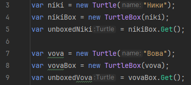 У первой универсальной коробки был указан тип Turtle, соответственно, переменная _animal и результат метода Get() для неё имеют тип Turtle.