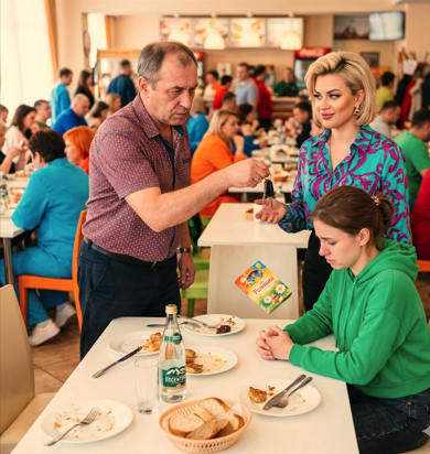 Дешёвая картонная коробка с нарисованными ромашками шлёпнулась на накрахмаленную скатерть, едва не опрокинув хрустальный бокал с минералкой. Тонкая прозрачная слюда на углу лопнула. Под ней виднелась жёлтая наклейка со скидкой из супермаркета у дома.