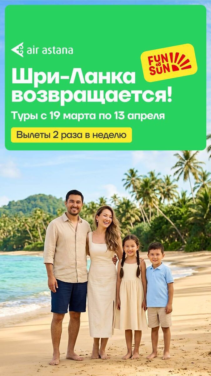 !* - Туры с 19 марта по 13 апреля - Вылеты 2 раза в неделю - Бизнес-класс доступен для бронирования Отличная возможность провести наурызовские выходные у океана🌊 ✈️ Шри-Ланка из Алматы а/к Air Astana 19.03 на 7 ночей от 707 000 ₸ *Стоимость указана на одного человека при DBL размещении и актуальна на момент рассылкиш Бронирование: wa.me/77077147170 Елена