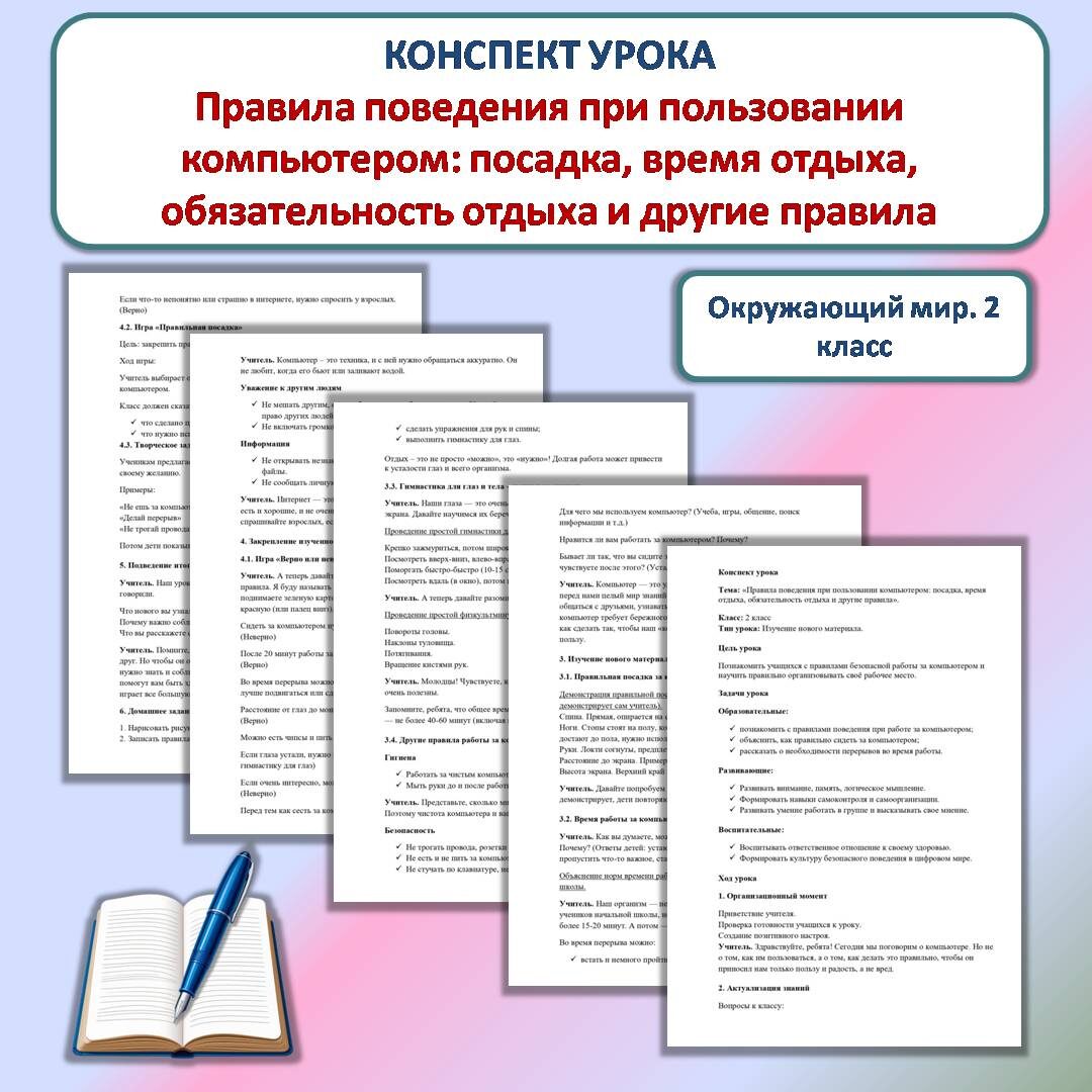 Конспект урока скачать здесь Презентацию к уроку скачать здесь Конспект урока «Правила поведения при пользовании компьютером: посадка, время отдыха, обязательность отдыха и другие правила» разработан для урока окружающего мира во 2 классе. Задачи: В разработке предусмотрены следующие этапы урока: 1. Организационный момент 2. Актуализация знаний и подведение к теме урока 3. Сообщение темы и задач урока 4. Изучение нового материала 5. Закрепление изученного материала Практические задания: 6. Итог урока 7. Домашнее задание на выбор Методическая ценность разработки заключается не только в её содержании, но и в доступности формулировок для младшего школьного возраста. Желаю успеха!