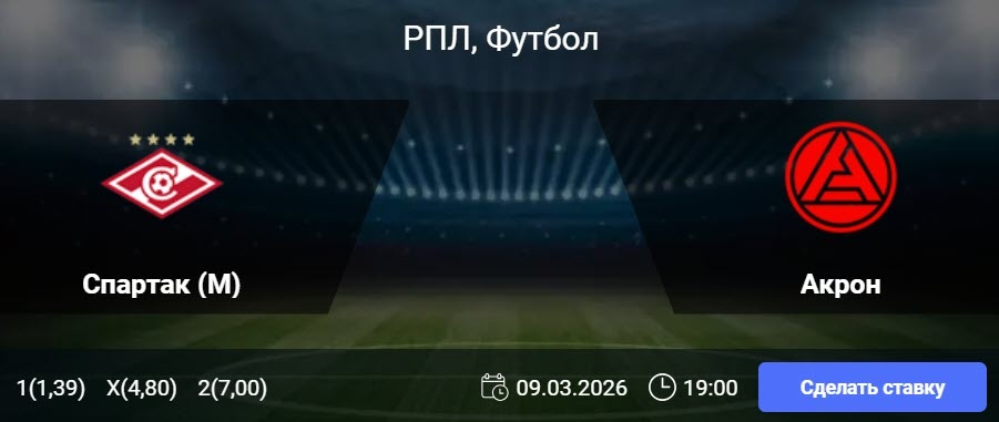 Статистика московского Спартака: Оборона москвичей давала сбои в пяти из шести последних встреч чемпионата. В родных стенах «Спартак» демонстрирует уверенную игру: пять побед и две ничьи в семи крайних матчах. При этом результативность дома остается умеренной: в 9 из 10 последних игр на своем поле команда не забивала более двух мячей. Статистика Акрона: В семи последних играх с участием тольяттинцев в РПЛ забивалось не более трех мячей. Гостевая статистика команды отличается бескомпромиссностью: серия без ничьих достигла восьми матчей (3 победы, 5 поражений). Атака «Акрона» на выезде работает стабильно: голы забивались в 9 из 12 предыдущих гостевых встреч. 🎯 П1 и ТБ (2,5) 🎲 кф (1,90) 🎯 ТБ (2,5) 🎲 кф (1,63) 🎯 Фора 1 (-1) 🎲 кф (1,61) 👉 СДЕЛАТЬ СТАВКУ 🎁 ФРИБЕТ WINLINE - 3000₽ (промокод: BETWIN) 👉 СМОТРЕТЬ ПРОГНОЗ