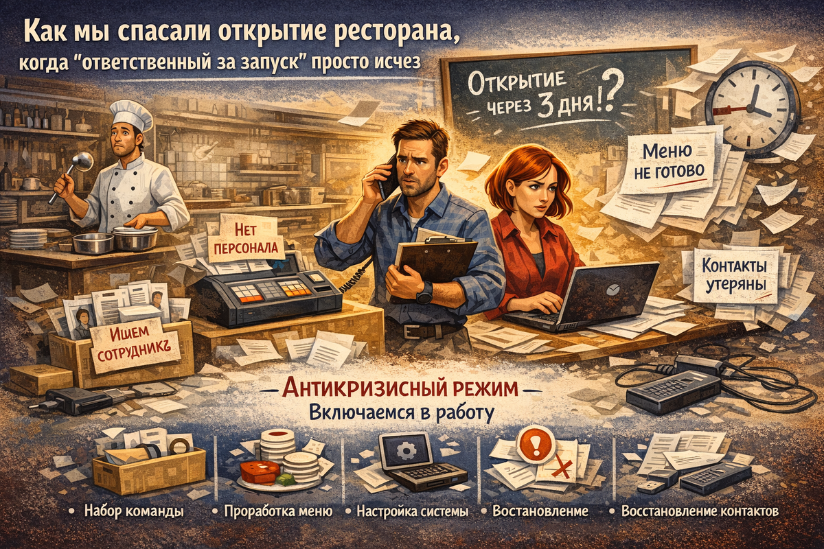 Запрос был вроде бы простой: открытие через 4 дня, нужна помощь в управлении и финальная доводка перед запуском. Договорились встретиться на следующий день. Приезжаю на объект — и довольно быстро выясняется интересная деталь: человек, который занимался открытием ресторана, просто пропал.