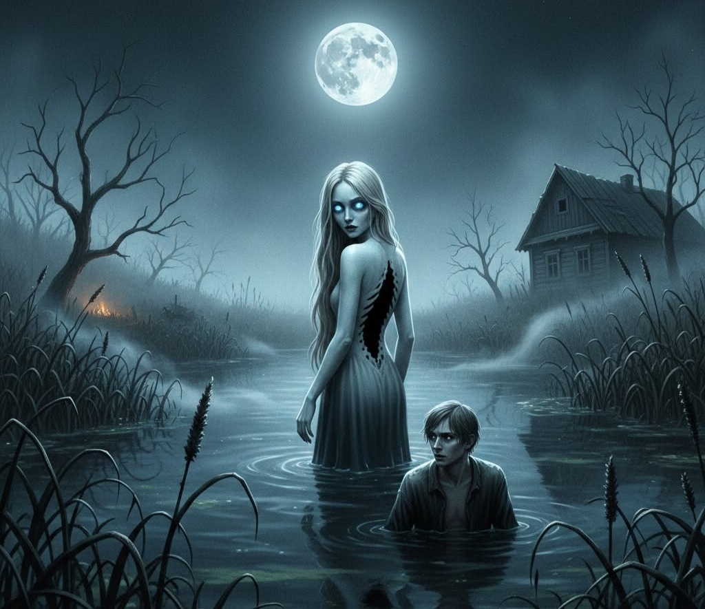 На берегу стояла вся деревня. Дети, старики, женщины — все в белых рубахах, молчаливые и бледные. Они образовали живой коридор, ведущий к воде. В конце коридора стояла Марина. Теперь она выглядела почти нормально, если не считать того, что её кожа в свете луны отливала синевой, а из-под ногтей сочилась черная жижа.