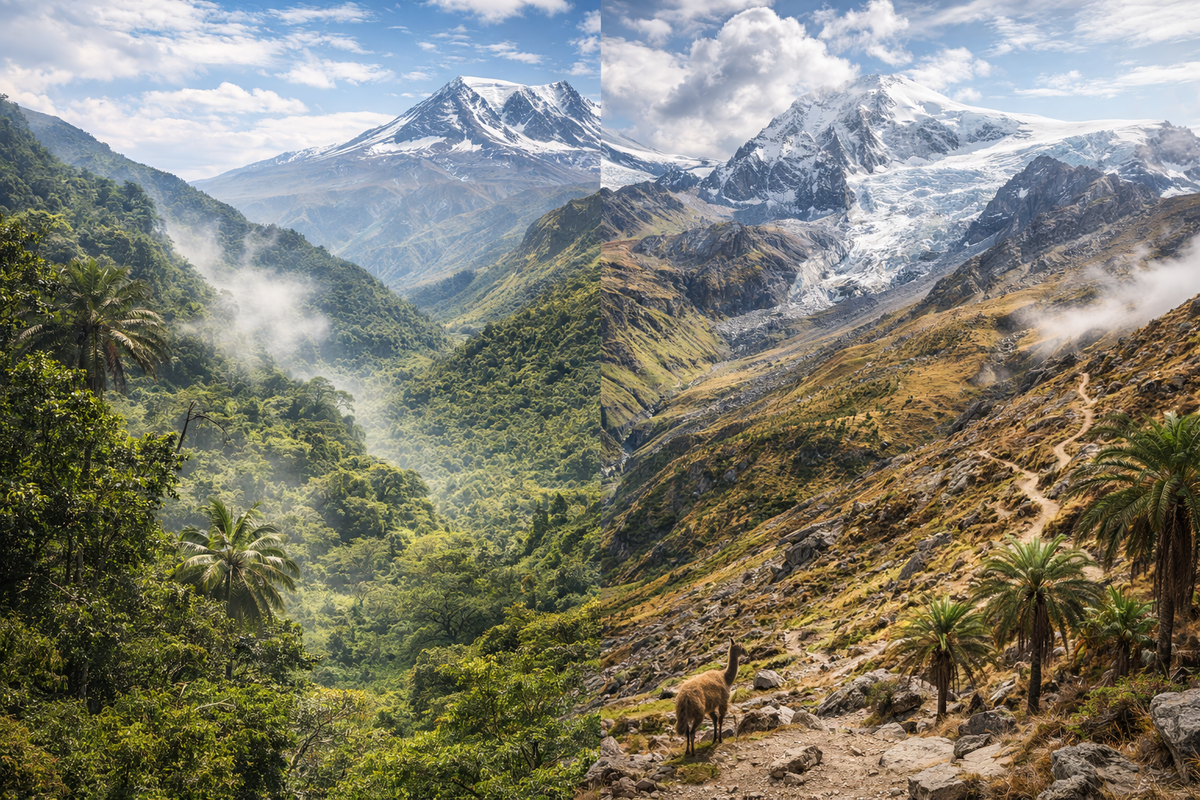 На планете существуют регионы, где за несколько часов можно попасть из одного климатического мира в другой. У подножия может быть жаркая пустыня, выше — густой тропический лес, ещё выше — холодные горные луга, а на вершине лежит снег. Такое резкое изменение условий связано с высотой, рельефом и движением воздушных масс. Иногда разница температур между нижней и верхней точкой может достигать 30–40 градусов. Поэтому такие места напоминают природную лестницу из разных климатических зон. И именно здесь можно увидеть, как резко меняется природа всего за несколько километров.
