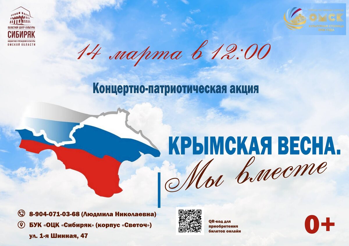 Концерт с патриотическими песнями и танцевальными номерами, посвящённый объединению России с Крымом. Перед началом мероприятия пройдут мастер-класс и работа фотозоны. Начало: 14 марта 2026 12:00 Стоимость: 300.0 руб. Адрес: г Омск, ул Красный Путь, д 68 Организатор: https://vk.com/public193485104 #Сибиряк_приглашает 🟦14 марта в 12:00 в Областном центре культуры «Сибиряк» состоится концертно-патриотическая акция Крымская весна. Мы вместе, посвящённую 12 годовщине объединения России с Крымом! ⬜Перед началом концерта : Тематический мастер класс Работа фотозоны ⬜В концерте прозвучат: Патриотические песни Красочные танцевальные номера 🟦Приходите на концерт, чтобы вместе насладится торжеством момента воссоединения Крыма и России! 🖇Купить билет... #развлечения_современная_музыка Узнать подробности, адрес или записаться на событие.