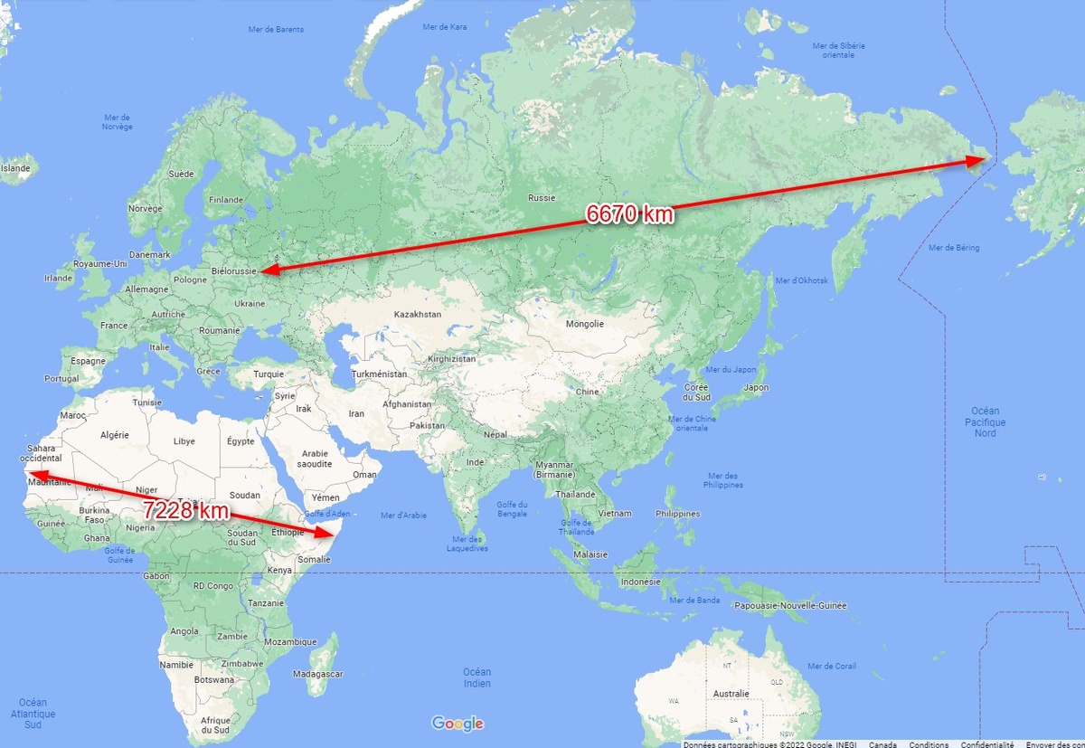 Но если открыть любой картографический сервис и измерить самые удаленные точки России и Африки, то получим неожиданные значения.