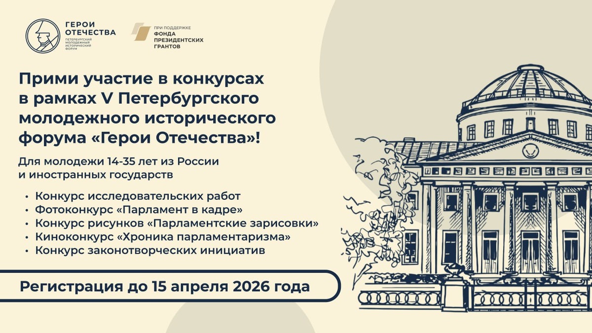 » Открыта регистрация на конкурсы в рамках V Петербургского молодёжного исторического форума «Герои Отечества», который состоится в середине мая 2026 года в Санкт-Петербурге — северной столице России. https://xn----7sbh4abisab1b4j.xn--p1ai/competition/28919-otkryta-registraciya-na-konkursy-v-ramkah-v-peterburgskogo-molodezhnogo-istoricheskogo-foruma-geroi-otechestva.html