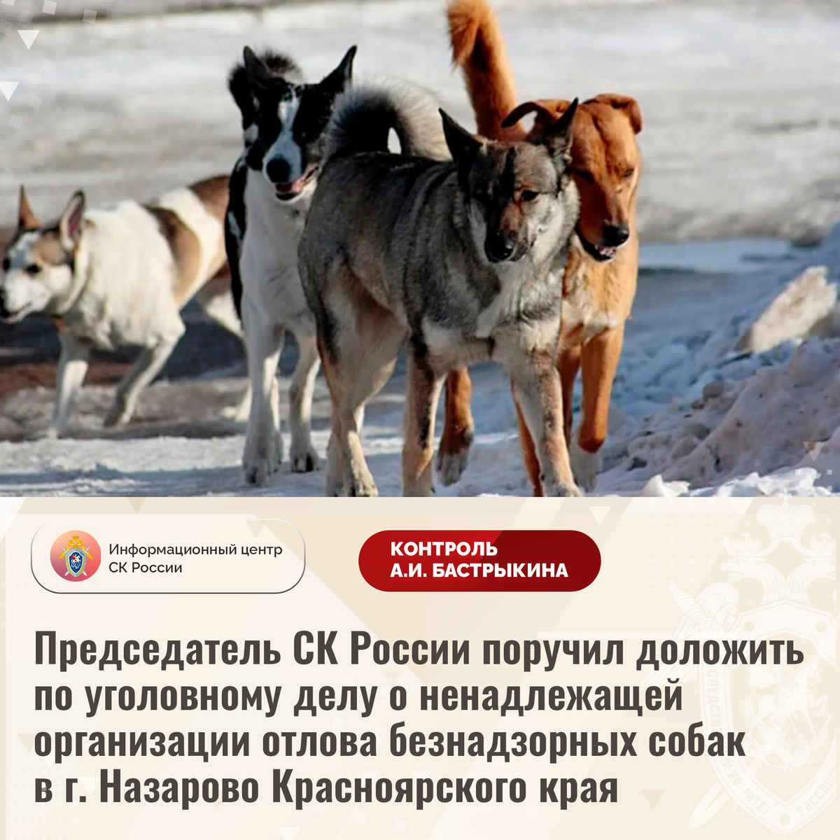 Председатель СК России поручил доложить по уголовному делу о ненадлежащей организации отлова безнадзорных собак в г. Назарово Красноярского края В социальной сети сообщается о бездействии профильных структур при организации отлова безнадзорных собак в городе Назарово Красноярского края. На протяжении длительного времени вблизи жилых домов, образовательных и медицинских учреждений обитает большое количество животных без владельцев, которые систематически нападают на граждан, в числе которых дети. Несмотря на имеющиеся нарушения, мер к отлову не принимается. В ГСУ СК России по Красноярскому краю и Республике Хакасии возбуждено уголовное дело. Председатель Следственного комитета Российской Федерации Александр Иванович Бастрыкин поручил руководителю ГСУ СК России по Красноярскому краю и Республике Хакасии Алексею Леонидовичу Еремину доложить о предварительных и окончательных результатах расследования уголовного дела. Исполнение поручения поставлено на контроль в центральном аппарате ведомс