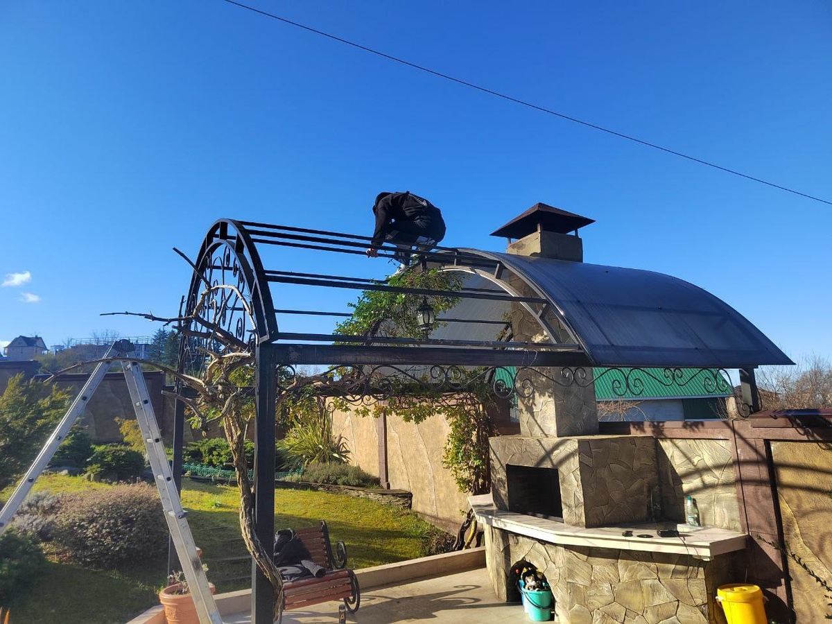 Демонтаж старого покрытия на существующем навесе.
