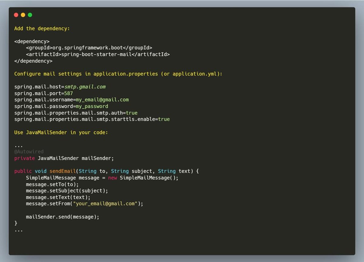 В Spring Boot есть готовое решение для отправки писем - spring-boot-starter-mail. Этот стартер уже включает всю необходимую конфигурацию и зависимости, поэтому вам не нужно вручную настраивать JavaMail или подключать десятки библиотек. Достаточно добавить зависимость, указать SMTP-настройки в application.properties или application.yml, и можно сразу отправлять письма из приложения. Spring Boot автоматически настроит JavaMailSender, а в коде останется лишь создать сообщение и отправить его. Это один из самых простых способов добавить email-уведомления, подтверждения регистрации, сброс пароля или системные алерты в ваше приложение. <!-- зависимость --> <dependency> <groupId>org.springframework.boot</groupId> <artifactId>spring-boot-starter-mail</artifactId> </dependency> # application.properties spring.mail.host=smtp.gmail.com spring.mail.port=587 spring.mail.username=my_email@gmail.com spring.mail.password=my_password spring.mail.properties.mail.smtp.auth=true spring.mail.properti
