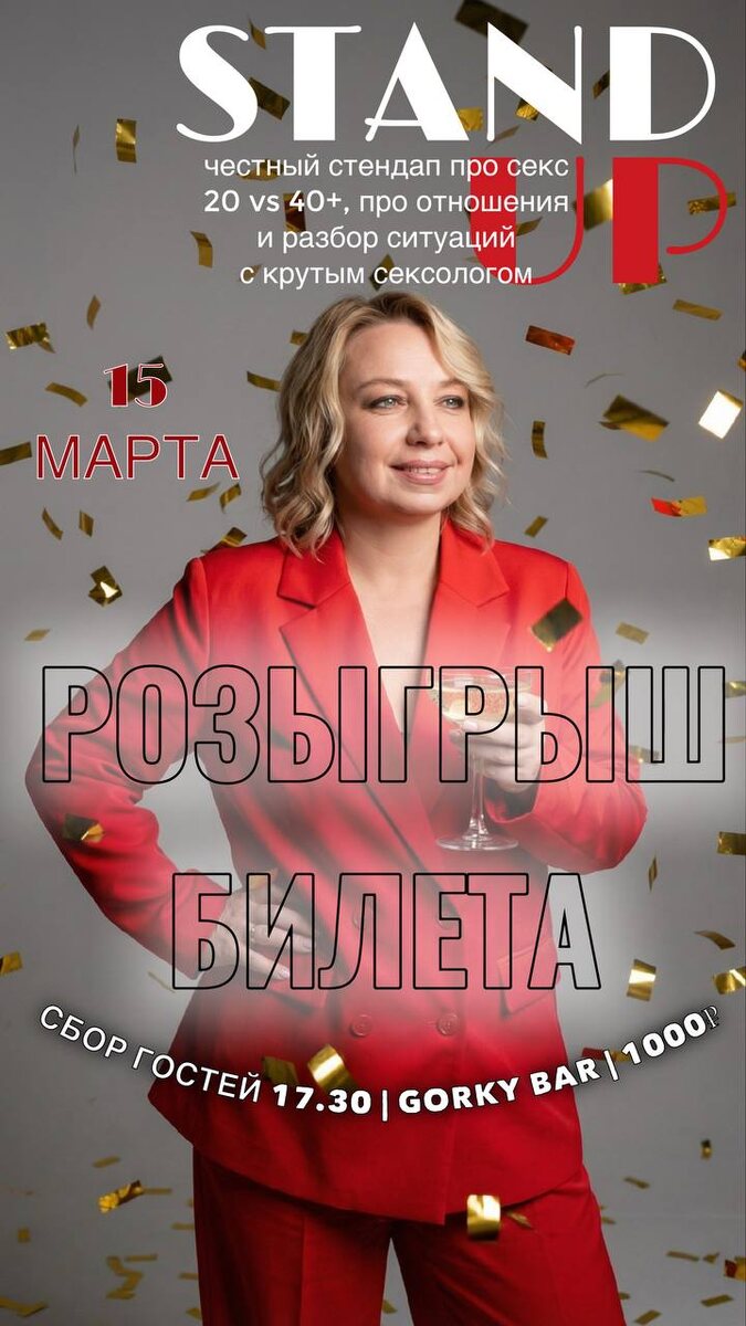 ! 🎁 Хватит грустить — идём на стендап! 15 марта в 17.30 в баре «Горький» буду ржать вместе с вами и психологом-сексологом Александрой Дёминой Будем говорить про ЭТО, сплетничать и задавать неловкие вопросы. Самое то для женского праздника! Что сделать, чтобы выиграть билет ( а их будет аж 2!!! ) ✔️Перейти по ссылке в ВК https://vk.ru/wall12479730_5707 ✔ сделать там репост этого поста к себе в сторис с текстом: Хочу на стендап к Ане! ✔ написать комментарий под постом ВК«Хочу!» И ты в игре! 😉 🍔 Хочешь с комфортом? Бронируй столик: 8 (3412) 78-70-80 🎟 Купить билет (если не хочешь надеяться на удачу): payform.ru/ehaLa4f/ 📍 Важно: Бар «Горький» (ул. Максима Горького, 72) 15 марта в 17:30. Не опаздывай, будет горячо!