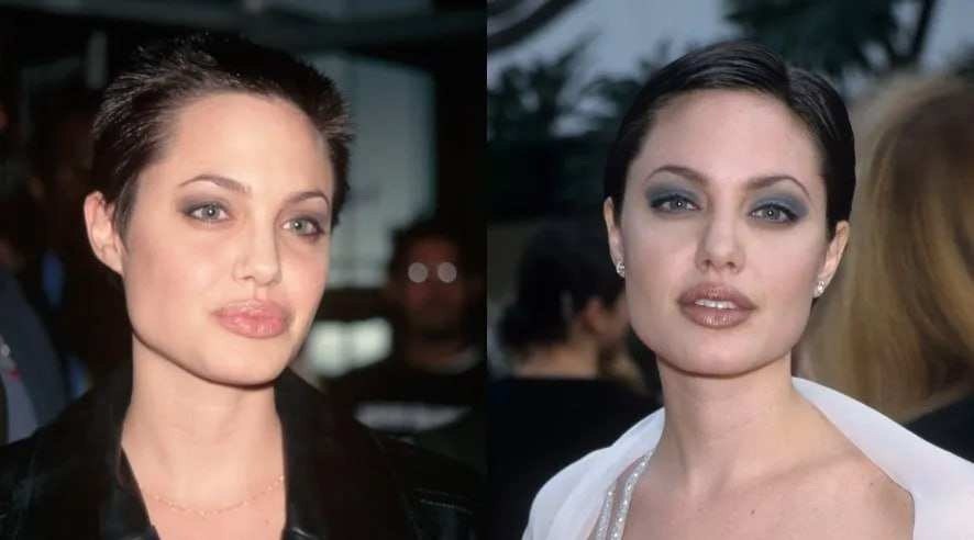 На старте своей карьеры Анджелина Джоли очень любила синие тени, тонкие брови и короткие стрижки во всех возможных вариациях: от гарсона до пикси. Волосы она красила преимущественно в темные оттенки.