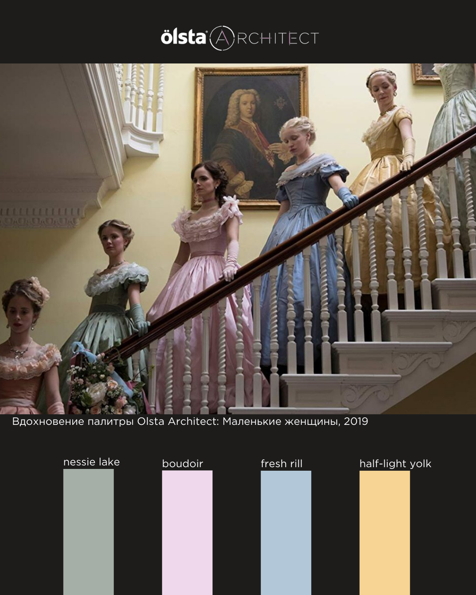 Вдохновение палитры Olsta Architect: “Маленькие женщины”, 2019 “Маленькие женщины” – адаптация классики Луизы Мэй Олкотт от Греты Гервиг, драмы о взрослении четырех сестер Марч в 1860-е годы. Визуальный стиль фильма передает эпоху и создает эмоциональный язык, в котором цвет становится частью повествования и психологического портрета героинь.