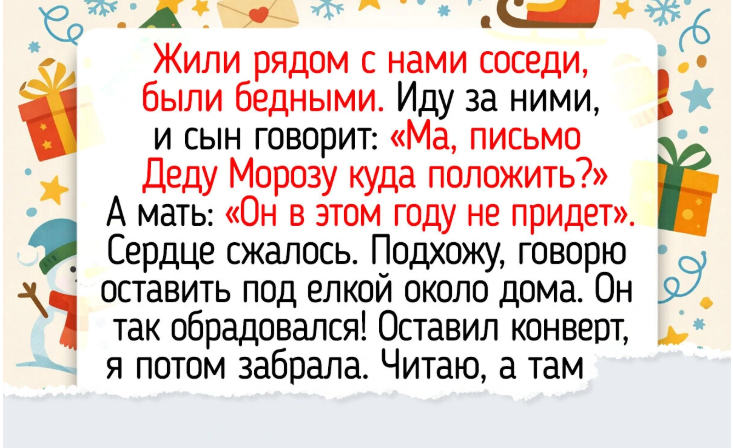 - Жили рядом с нами соседи, были бедными. Иду как-то за ними следом и слышу, сын спрашивает: «Мам, а письмо Деду Морозу куда положить?» А она глаза прячет: «Он в этом году к нам не придет». У меня сердце сжалось. Не выдержала, подхожу и говорю мальчишке: «Как не придет? Оставь письмо вон под той елкой, там его почта». Мать на меня смотрит с недоумением. Мелкий так обрадовался! Оставил он конверт, я потом незаметно забрала. Читаю, а там... никаких игрушек. Просит теплую куртку себе и коляску для сестренки. Я помчалась в магазин: купила две куртки, сладости, коляску. Сложила гору подарков у их двери, громко постучала и убежала на пролет ниже. Слышу, открывается дверь, тишина секунду, и потом детский крик восторга. Боже, у меня самой слезы градом потекли. Ради таких моментов и стоит жить.