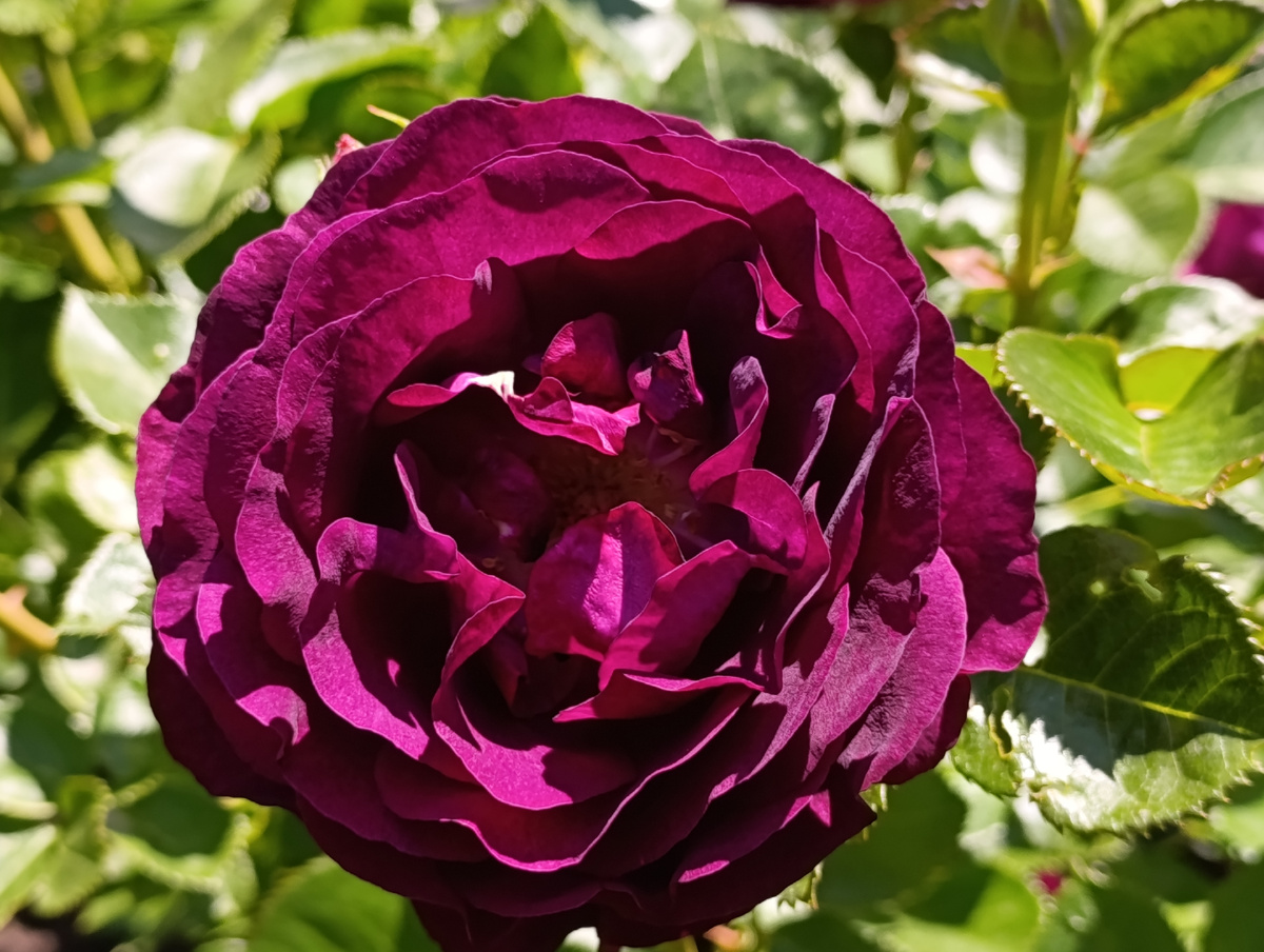 Цветки глубокого, бархатистого пурпурного оттенка, старомодной формы, густо-махровые, с интенсивным ароматом гвоздики и лимона. Округлый куст со слегка изогнутыми побегами, темно-зеленой, полу-глянцевой листвой.
