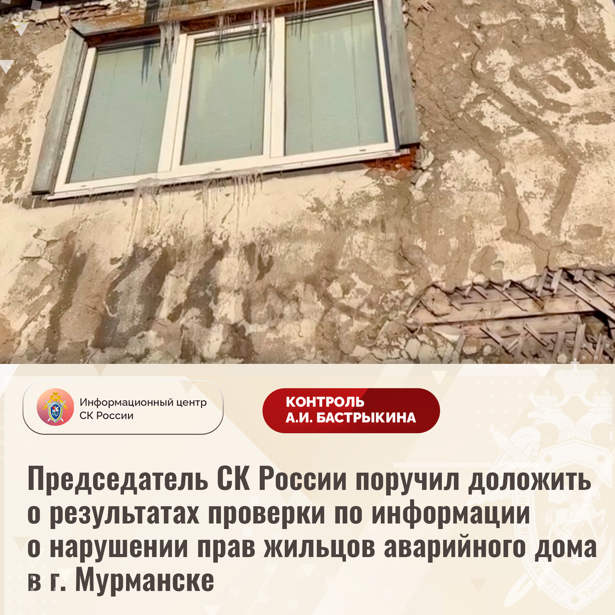 Председатель СК России поручил доложить о результатах проверки по информации о нарушении прав жильцов аварийного дома в г. Мурманске В сети Интернет сообщается о нарушении прав жильцов многоквартирного дома на улице Полухина в городе Мурманске. В связи с непринятием мер к очистке кровли здания 1960 года постройки от снега жилые помещения затапливаются, что приводит к образованию сырости и повреждению отделочных материалов. В 2017 году строение признано аварийным, однако до настоящего времени благоустроенное жилье гражданам не предоставлено, срок расселения установлен только на 2028 год. В СУ СК России по Мурманской области организована процессуальная проверка. Председатель Следственного комитета Российской Федерации Александр Иванович Бастрыкин поручил руководителю СУ СК России по Мурманской области Андрею Александровичу Ефремову доложить о ходе и результатах процессуальной проверки. Исполнение поручения, а также ход процессуальной проверки поставлены на контроль в центральном аппарате