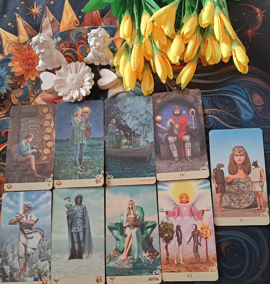 Твой расклад можно разделить на три смысловые части: чем занят он (8 Пентаклей + Паж Пентаклей), что прояснится в его намерениях (Паж Мечей + 6 Мечей) и что прояснится в ваших чувствах (Паж Кубков + Королева Кубков), а также главный урок пары (Император и Влюбленные).