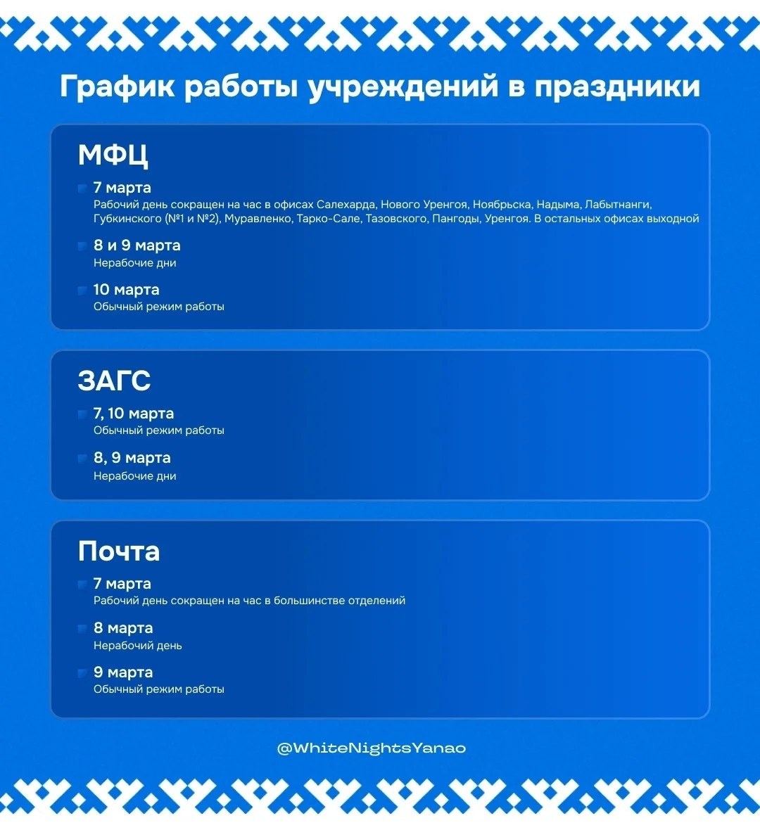 Праздничные дни продлятся три дня — с воскресенья по вторник (7–9 марта) . В связи с этим многие учреждения Ямала изменят график работы